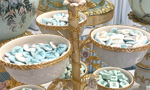 Luxury blue and gold dragée display arranged in ornate porcelain bowls, Victorian-inspired wedding sweets with elegant detailing, premium confectionery in Qatar
