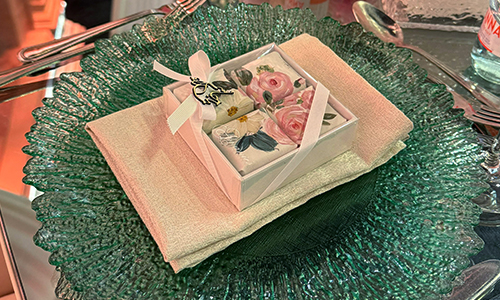Handpainted flower chocolates for wedding guest plates, elegant and detailed, displayed in a luxurious sweet corner in Qatar