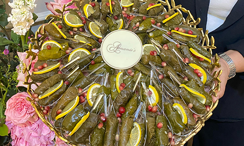 Tray of gourmet vine leaves individually served in verrines, made with fine ingredients for luxury wedding appetizers in Qatar