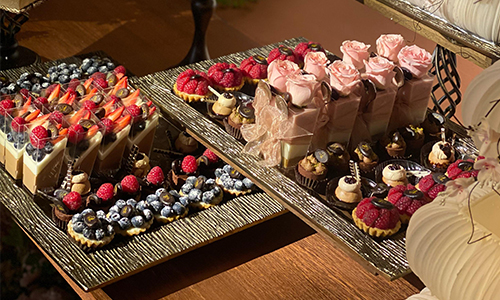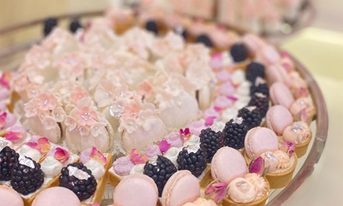 Assortment of gourmet bites decorated with fresh edible flowers and crafted using premium ingredients, elegant and luxurious wedding dessert display in Qatar