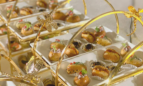 Gourmet saltie bites elegantly arranged on tiered stands, luxury wedding appetizer presentation in Qatar