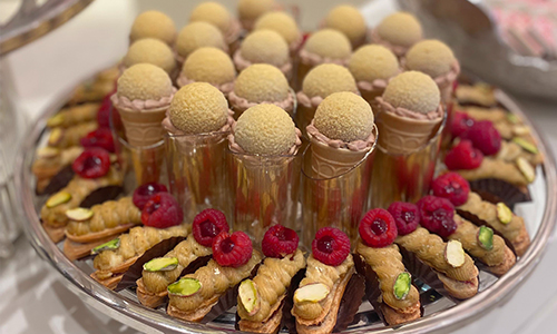 Assortment of gourmet bites decorated with fresh edible flowers and crafted using premium ingredients, elegant and luxurious wedding dessert display in Qatar